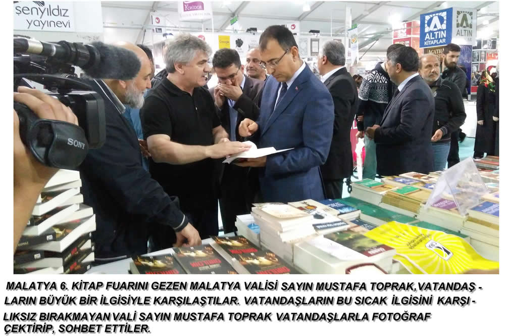 1- Malatya 6.Kitap fuarını gezen Malatya Valisi Sayın Mustafa TOPRAK, Vatandaşların büyük bir ilgisiyle karşılaştılar. Vatandaşların bu sıcak ilgisini karşılıksız bırakmayan vali sayın Mustafa TOPRAK Vatandaşlarla fotoğraf çektirip, sohbet ettiler.
